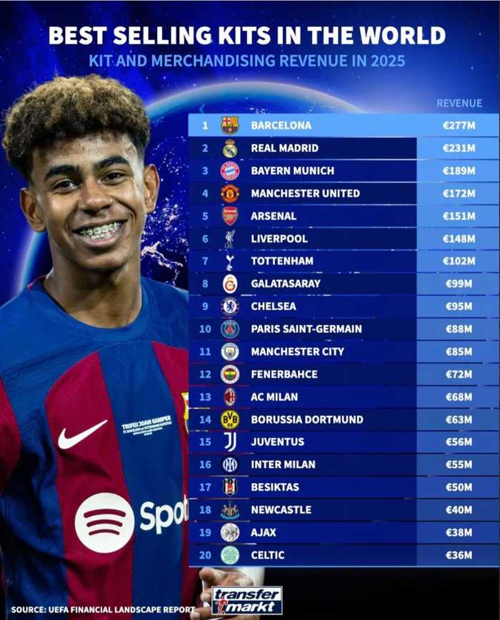 欧足联近日发布了《欧洲俱乐部财务与投资格局》报告,对欧洲足坛的整体财政状况与投资趋势进行了系统梳理。德转统计了2025年球队球衣及周边销售营收榜。